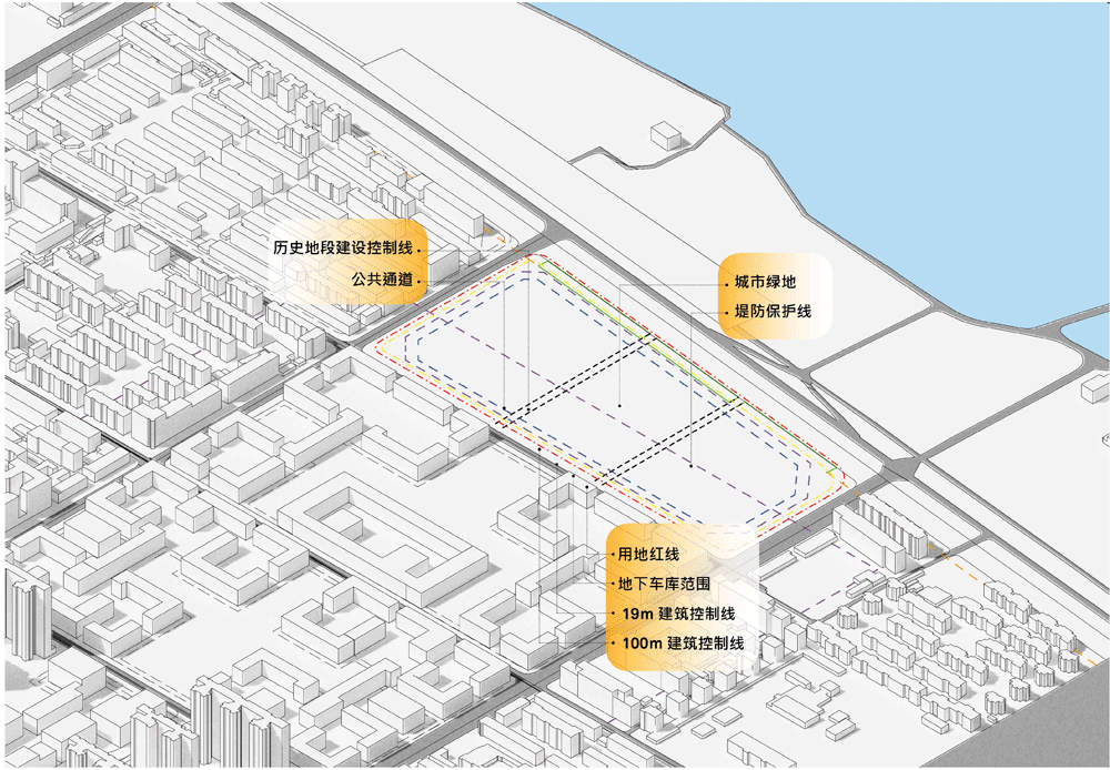设计保留原城市设计的轴线结构,通过一条贯穿南北的中轴线连接临江和街坊两个高价值城市空间。住宅塔楼依次布局于中轴两侧,形成居住生活的东西两坊;奢华酒店和超甲级办公的商务塔楼沿江设置;而容纳会议中心、体育中心和商业街区的休闲商业空间位于中部,作为整个片区的衔接。设计通过体量错动及朝向调整,让各塔楼景观资源最大化,尽享江景、坊景、院景多维度景观。