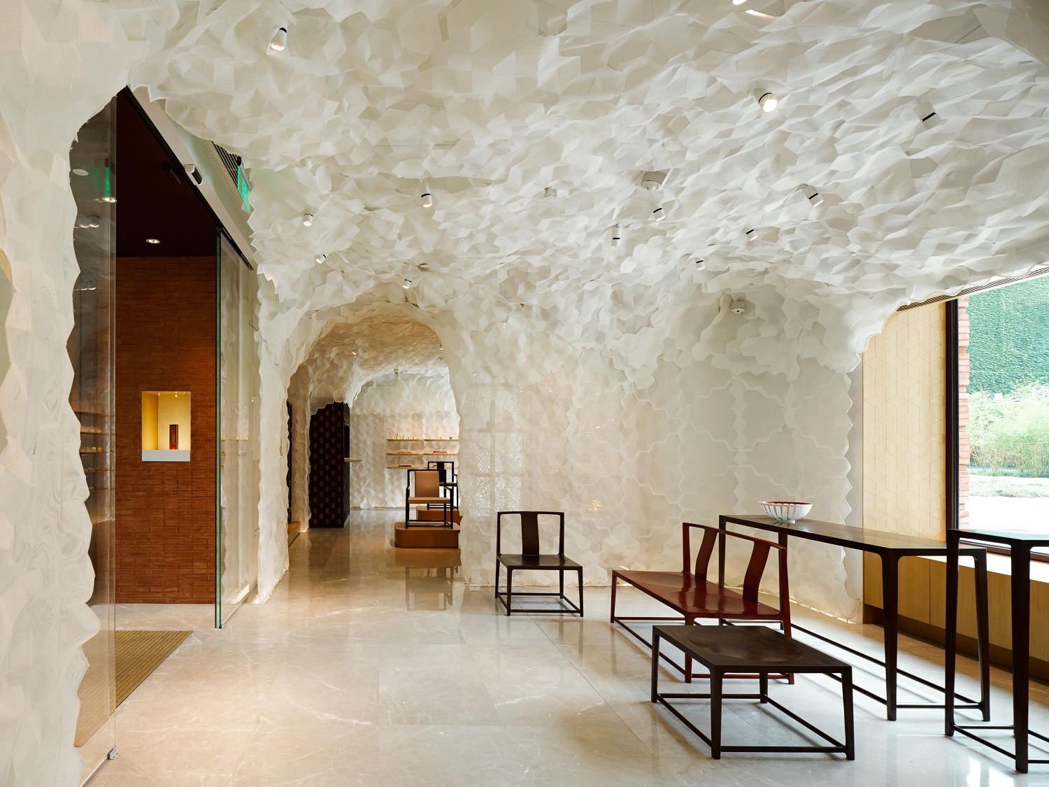 隈研吾在为「上下」之家设计空间时,并没有把它当做一般的空间设计,而是好像设计一件巨大的衣服。这些拥有六角形机理的白色记忆织物,就好像是竹编、刺绣等中国传统手工艺在现代科技社会中的倒影,它与用于地板、墙面的自然纯朴的木料和石材,形成奇妙的对照和反差,却又和谐地融为一体。