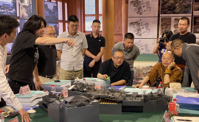 ▲孟凡浩给灵隐寺光泉方丈和王澍院长汇报灵隐寺扩建方案 ©line+
